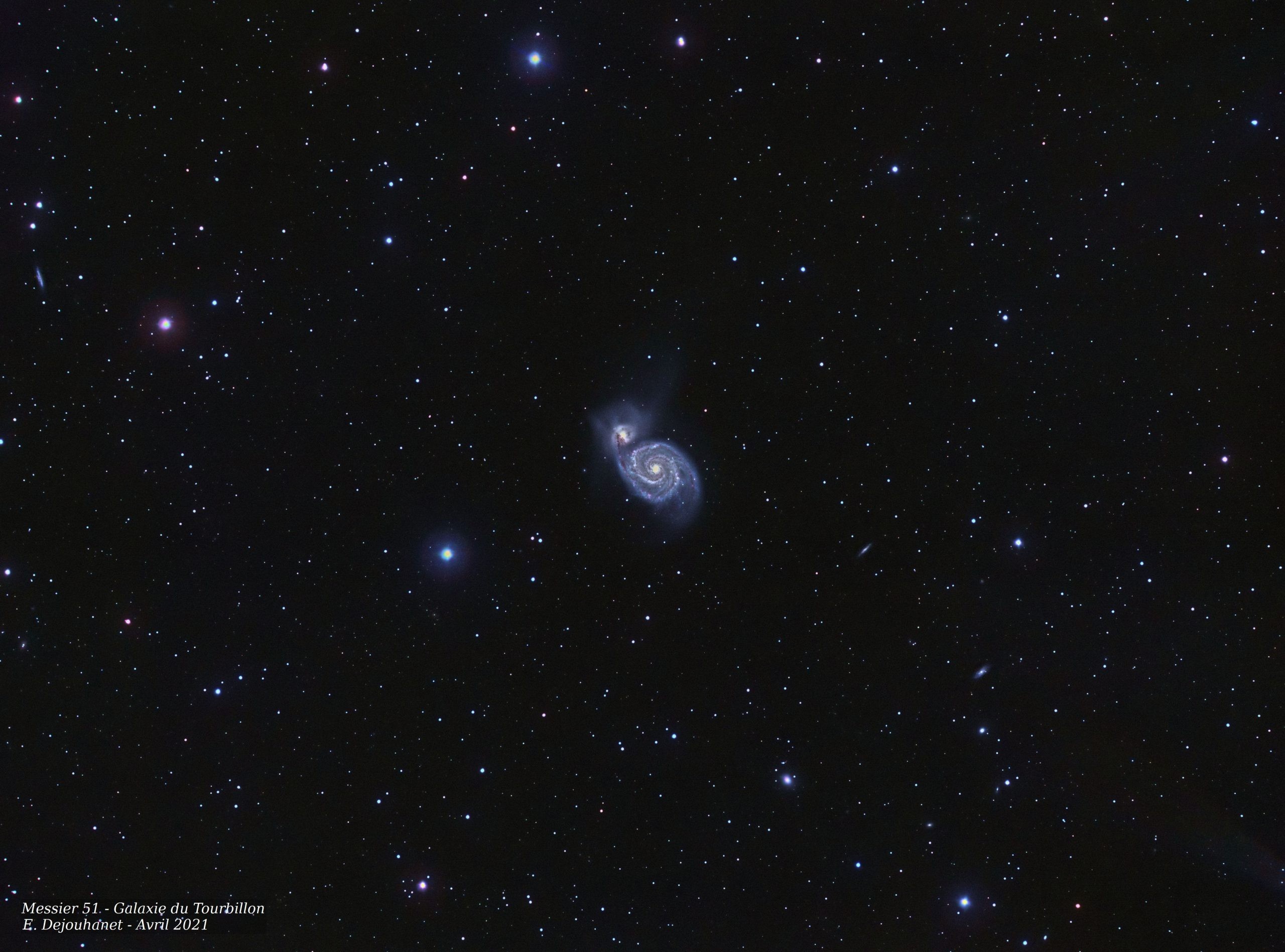 M51 – Whirlpool Galaxy What we call the Whirlpool Galaxy is actually a pair of galaxies interacting with each other. A scenario proposes that the small one, NGC5195, did traverse a few times its companion and is now located slightly behind the larger M51. The iconic two galaxies of the M51 object are special to… Continue reading M51 – Whirlpool Galaxy
