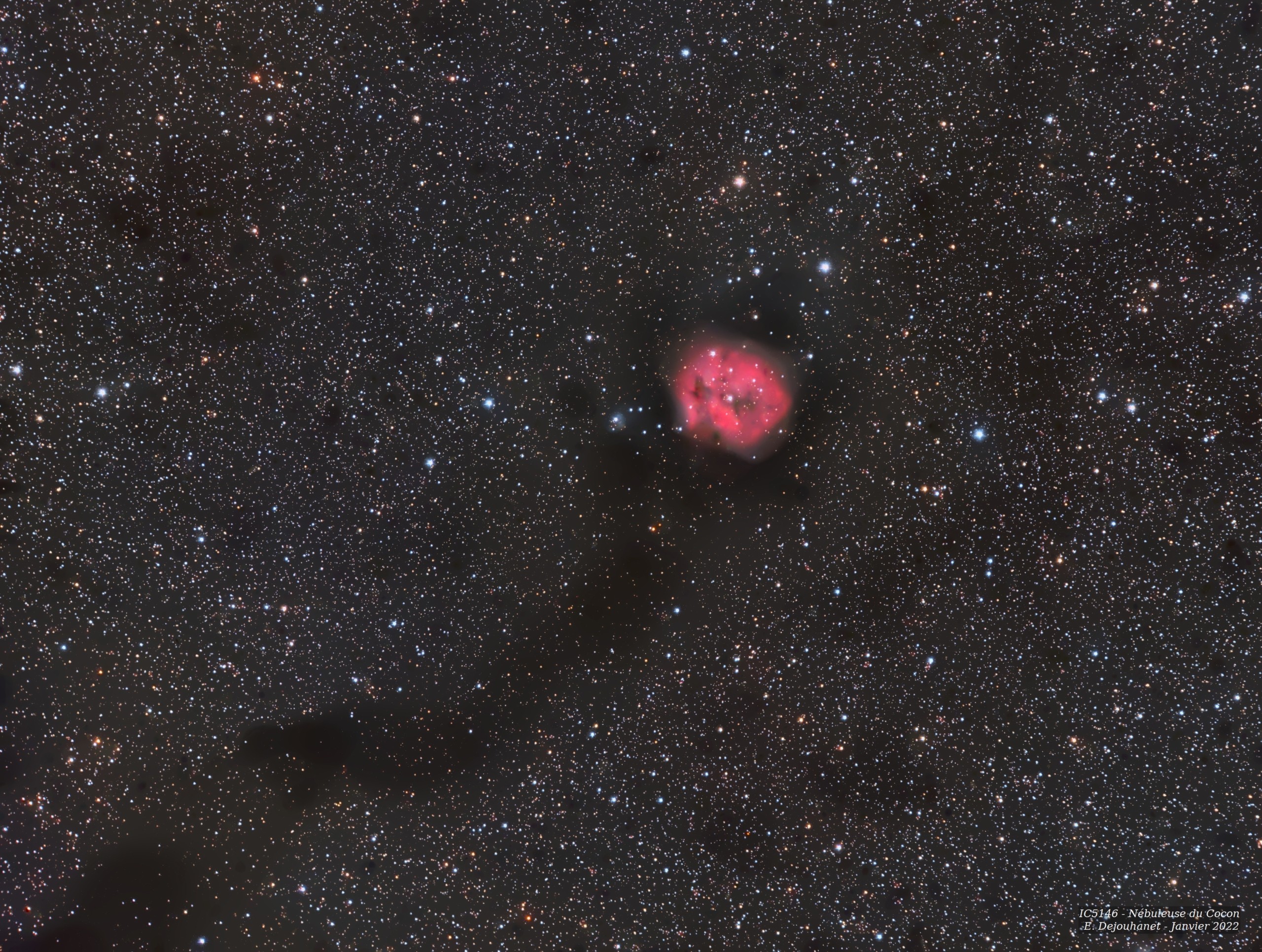 IC5146 – Cocoon Nebula Small silky ball laid at the end of a dark footpath, between Cassiopea and Cygnus, the small Cocoon Nebula glows with soft red and mauve colors in a sanctuary of stars. This lovely object, catalogued IC5146, Sharpless 2-125 or Caldwell 19, is a hot emission hydrogen cloud where young stars are… Continue reading IC5146 – Cocoon Nebula